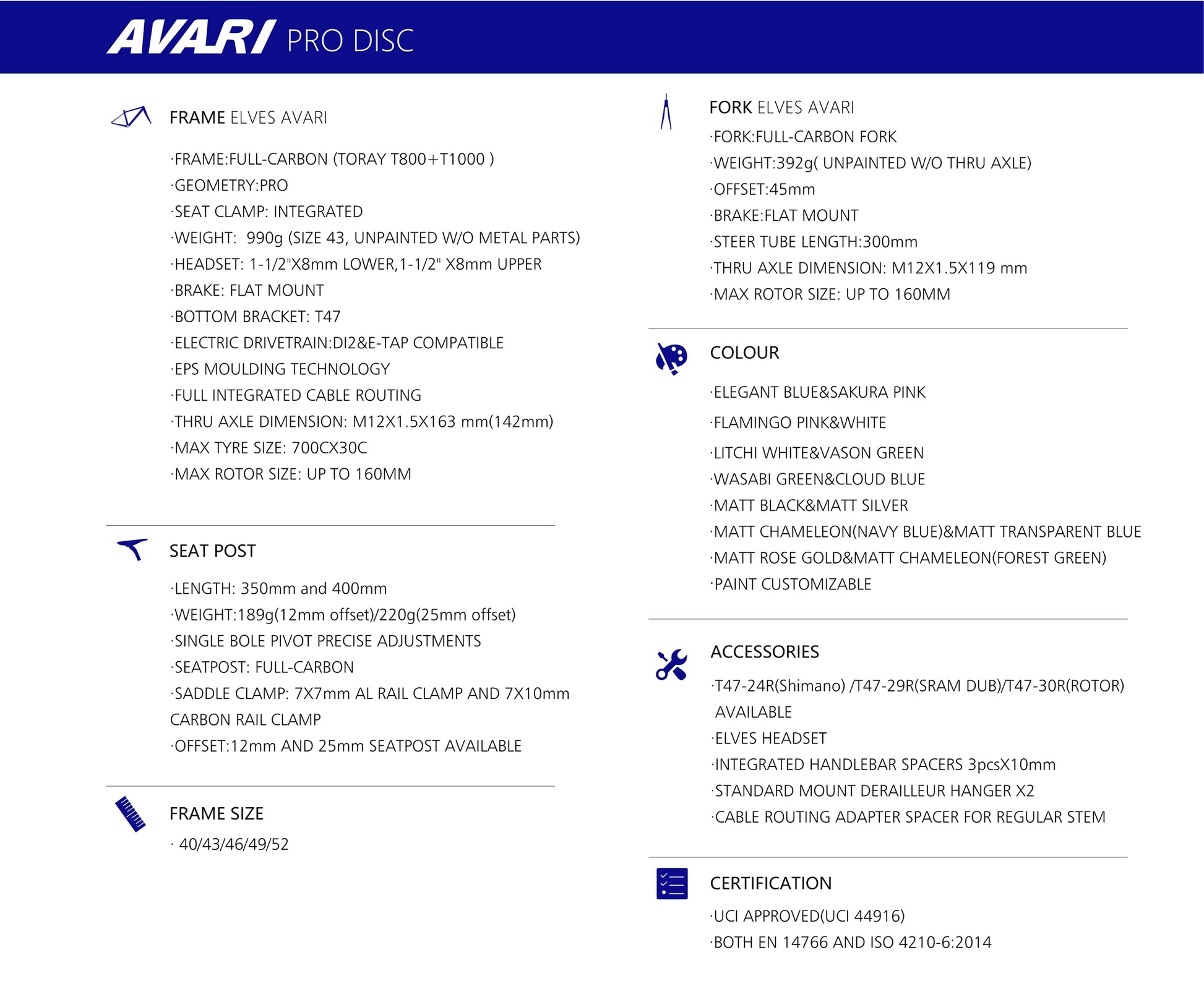 Cadre de vélo de route Elves Avari Pro UCI Disc